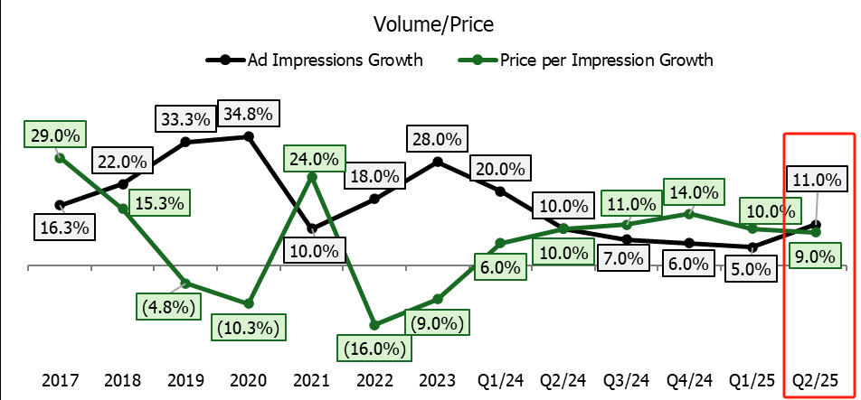 此外,Meta的2025年Q2财报也明晰体现出AI运行下告白业务的全面提效。Meta告白收入同比增长16%,达到362亿好意思元,成为本季增长的主要能源之一。扎克伯格在财报电话会上指出,AI器具对告白推选和创意生成的复旧,权臣提高了投放效率,其中告白展示次数增长11%、平均价钱高潮9%,这标明平台不仅在提高流量变现效率,也慢慢设立起高价值内容生态。对此,扎克伯格称,告白业务照旧再行的生成式东谈主工智能功能中赢得了“可不雅”的收入。