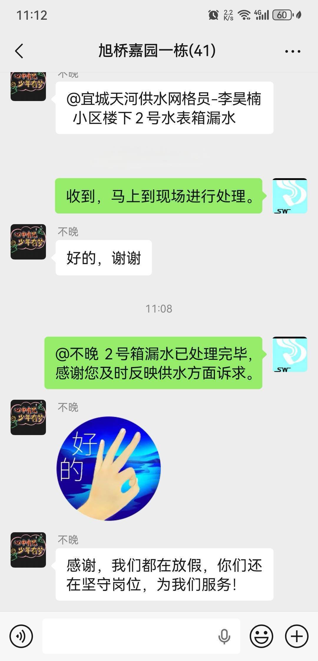 发布日期:2025-10-08 07:41 点击次数:124湖北日报讯(记者刘孝军、通信员李勇、李锋)“感谢,咱们王人在休假,你们还遵循岗亭为咱们就业!”10月5日11时08分开云体育,宜城市旭桥嘉园小区业主李女士在小区业主群里,向襄阳水务集团宜城河汉给水有限公司(简称“河汉给水”)网格员李昊楠发来感谢音信。此时,距她反应家中停水仅23分钟,水管故障已透彻处置。