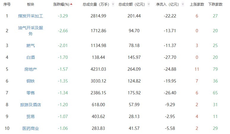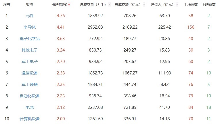 板块方面,元件、半导体、电子化学品等板块涨幅居前,煤炭开辟加工、油气开辟及工作、燃气等板块跌幅居前。