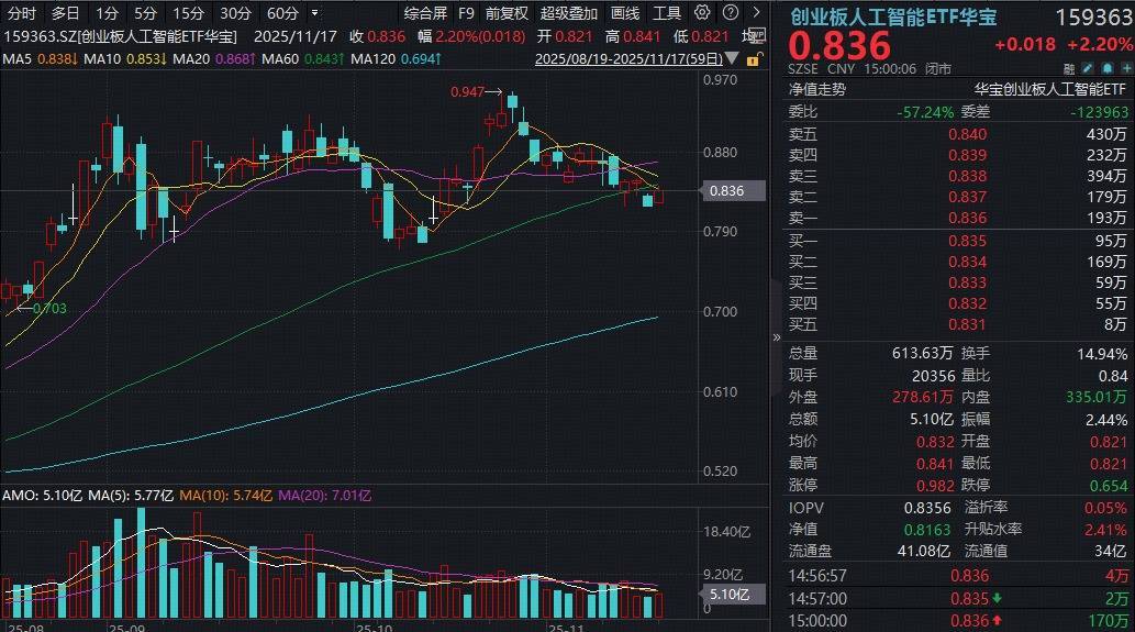 热门ETF方面,双线布局算力+AI应用的创业板东谈主工智能ETF(159363)场内反包收涨2.2%,单日成交超5亿元,环比放量彰着,资金近5日加仓5834万元。