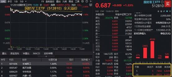 地缘时局倏地趋紧,国防军工的确异动!当天场内热门国防军工ETF(512810)高开逾2%,全天高位初始,场内收涨1.33%,大幅跑赢阛阓!场内全天溢价来回,自大买盘相对强势,此前10日累计近9000万元资金提前布局。