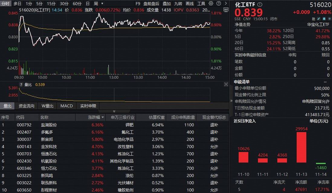 化工板块当天走出过山车行情。反馈化工板块全体走势的化工ETF(516020)开盘后飞快拉升,尔后转眼跳水翻绿,随后再度荡漾上行,盘中场内价钱涨幅一度达到1.81%,截止收盘,涨1.08%。