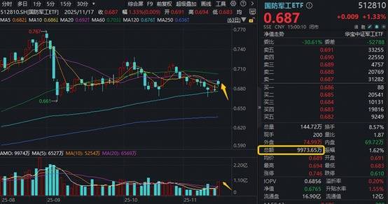 时刻面上看,国防军工ETF(512810)受大市影响收出阴线,仍放量连收5日及10日均线,全天成交9974万元,环比激增超113%,反馈多头势力显赫更强。