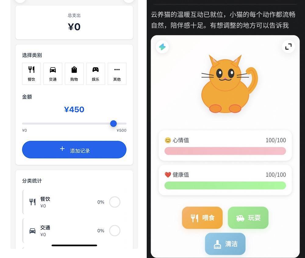 ▲用灵光App一句话生成“记账”和“云养猫”应用(图源:智东西)