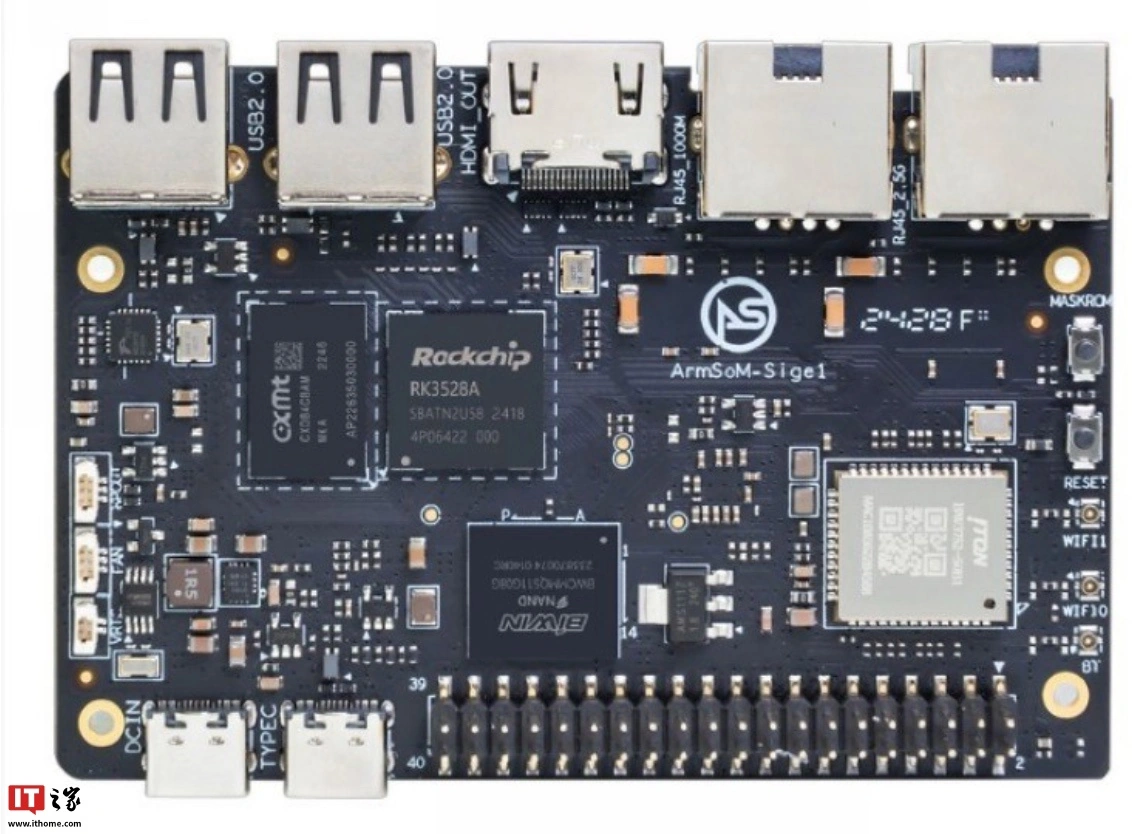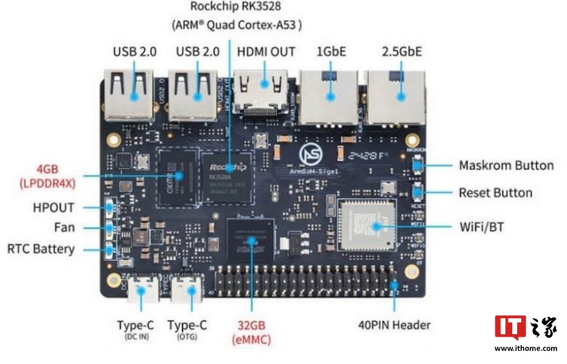 该机板载四中枢瑞芯微(603893) RK3528 A53 措置器,集成 Mali-450 核显,接纳 4GB LPDDR4X RAM 及 32GB eMMC 存储空间,撑握通过 microSD 储存卡彭胀。