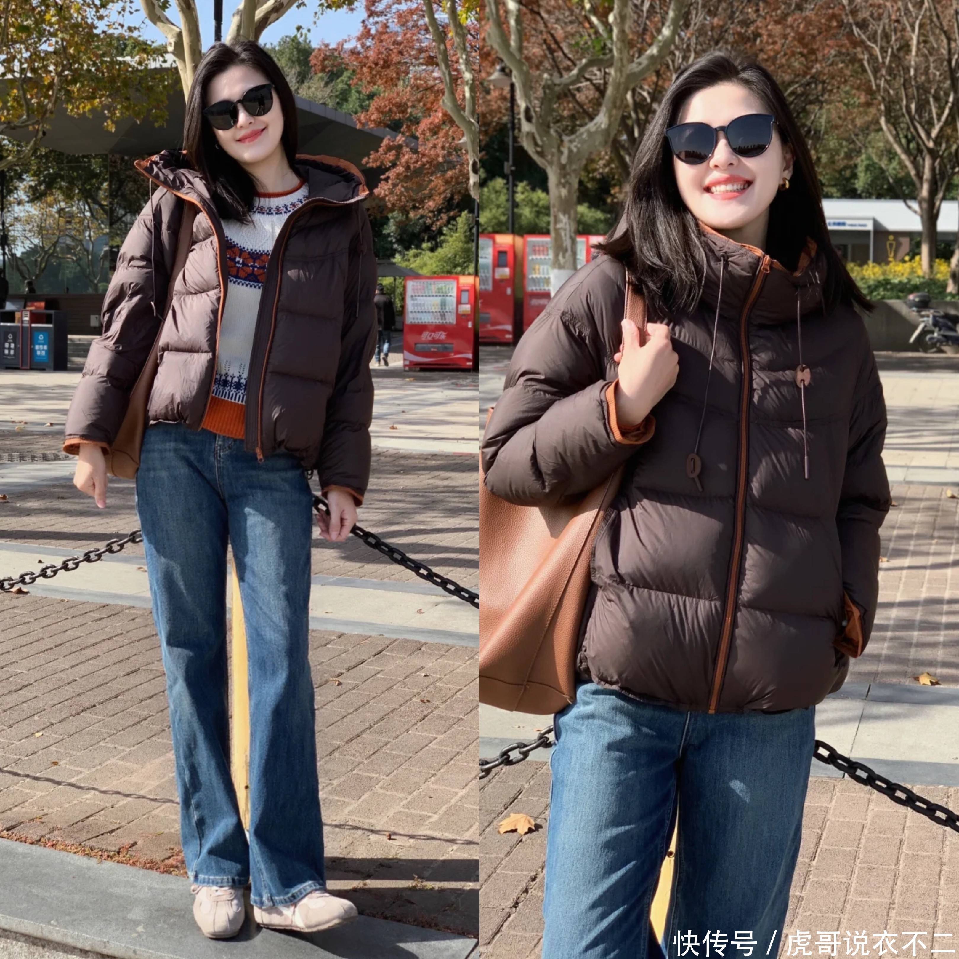 轻熟风雷同也慎重颜色搭配,棕色短款羽绒服,内搭白色毛衣打底,下半身高腰牛仔裤+率领鞋,举座颜色搭配畸形的散漫且天然不突兀,明暗蚁集,内搭的白色与橙色撞色,畸形的减龄,允洽平素穿搭。