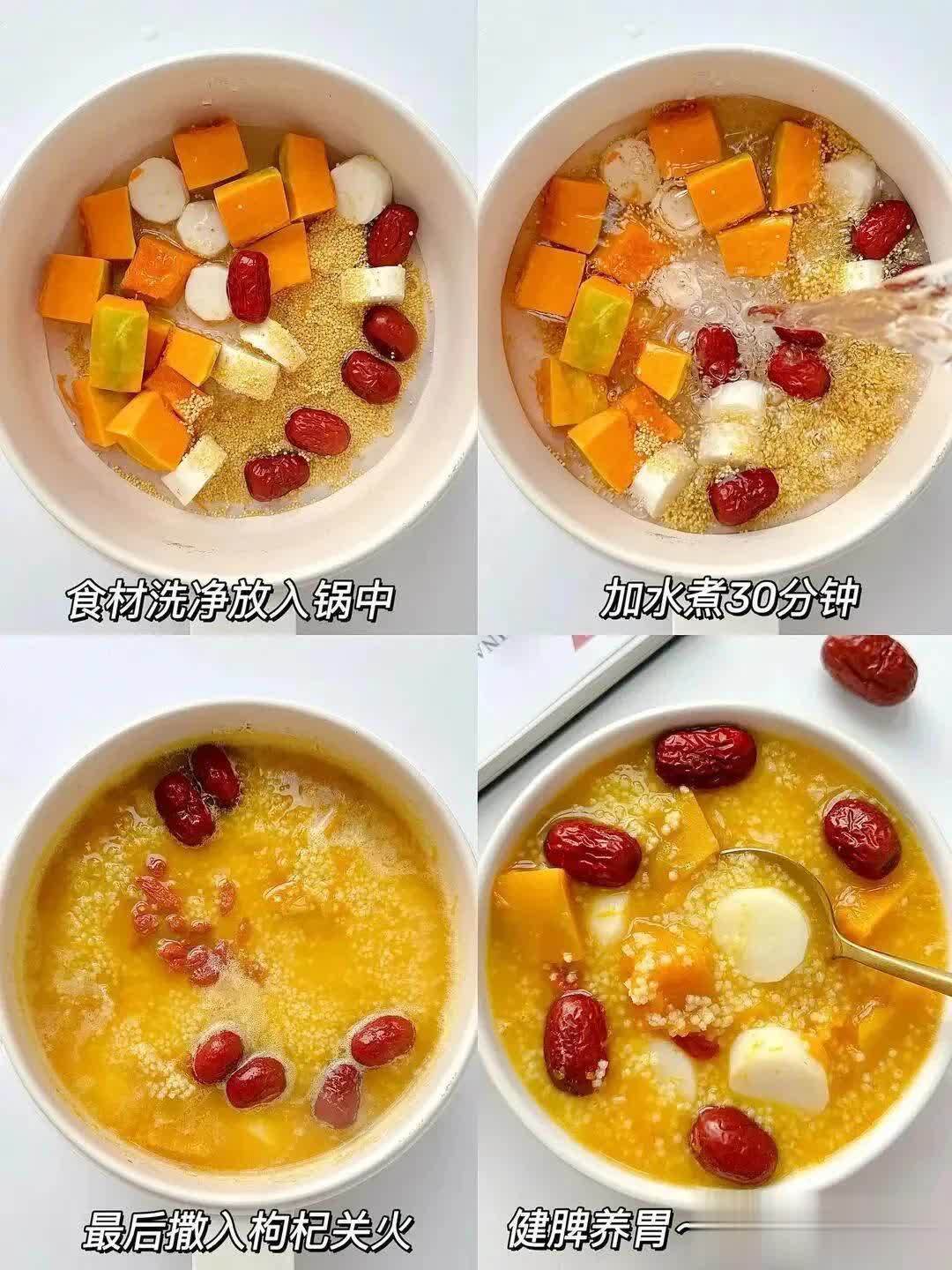 小米能健脾和胃,南瓜含有丰富的果胶,可保护胃黏膜,二者熬制成粥,简易又养胃,是长幼齐宜的家常适口。